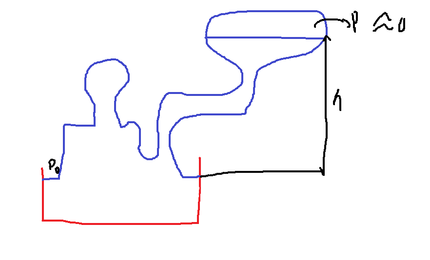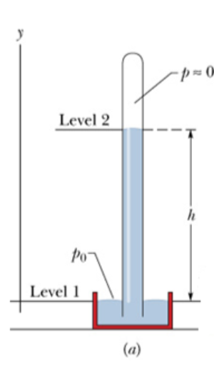 수은 기압계(기둥 위에 있는 공간의 압력은 0으로 무시한다.) 이 그림을 보십시오. 이 기구는 대기의 압력을 측정하는 기구입니다. 대기가 level 1의 수은을 누를 것이고, 누른 만큼 수은은 유리 기둥을 타고 올라갑니다. 이때 올라간 높이 h만큼 압력이 작용했다 라고 보면 되는 겁니다. 여기서 대기압 p0는 $p{_0}=\rho gh$ 로 표현할 수 있는데, 이는 식 $p{_2}=p{_1}+\rho g(y{_1}-y{_2})$ 에서 y1=0, p1=p0, y2=h, p2=0으로 둔 것입니다. 쉽게 설명하자면 압력 p는 $$p=\frac{F}{A}=\frac{mg}{A}=\frac{\rho \times V\times g}{A}=\frac{\rho \times A\times h\times g}{A}=\rho gh$$ 이기 때문이라고 생각하면 됩니다. 여기서 A는 면적입니다. 이전 글을 참고하셔도 됩니다. https://saeutang.tistory.com/6